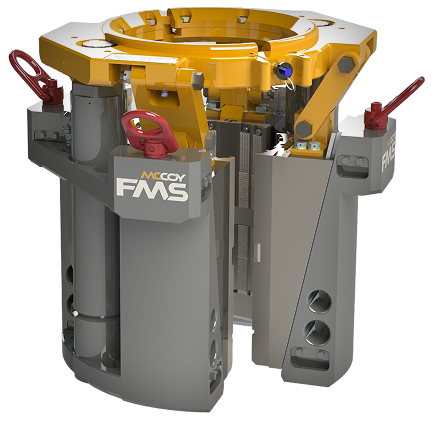 McCoy’s smartFMS is a rotary equipment developed to handle casing using replaceable die carriers and provides back-up torque of up to 50,000 ft.lbs. for 350 Ton FMS and up to 100,000 ft.lbs for 500 Ton FMS from first pipe joint, hence removing the need for integrated backups and manual tongs. This is a fully connected device that in real-time provides information on the state of the tool to the driller’s display (also used with a smartCRT). Both tools are constantly monitored, providing enhanced safety and reassurance that these are not open at the same time. smartFMS increases efficiency and safety by eliminating human error and guaranteeing consistency and repeatability of operations.